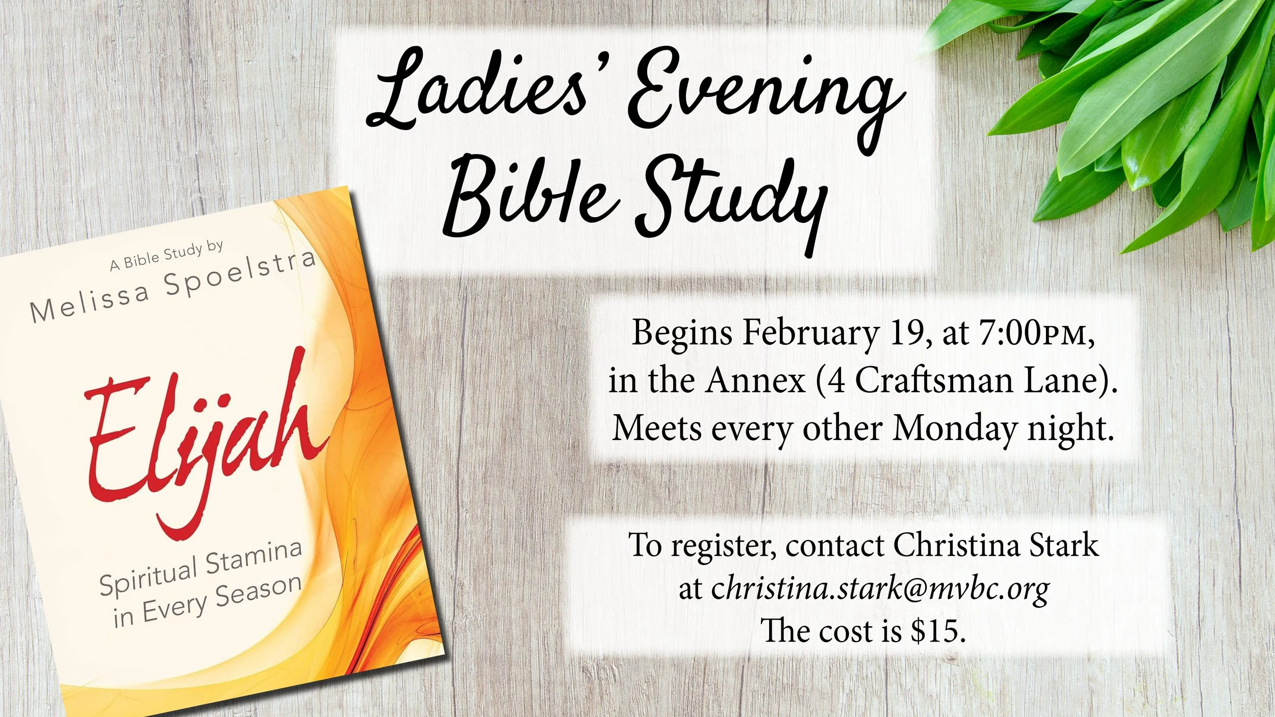 This winter and spring, Ladies’ Evening Bible Study will be digging into the life of the prophet Elijah using parts of the books of I and II Kings and Melissa Spoelstra’s Bible study, Elijah: Spiritual Stamina in Every Season. We will meet every other Monday from 7:00pm-8:30pm, starting February 19 and continuing through mid-May.
